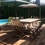 Chalet Intime Avec Sa Piscine Et Sauna is equipped with a microwave oven, a fridge, and kitchenware for self-catering in an outdoor dining area.